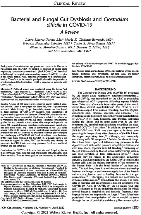 Results: A total of 384 papers were retrieved and 21 fulfilled selection criteria. Later, a new paper was identified, thus 22 papers were reviewed. Main findings: (1) gut bacterial dysbiosis has been found in fecal samples of COVID-19 patients, with enrichment ofopportunistic organisms and decrease of beneficial commensals such as Faecalibacterium prausnitizii. Dysbiosis is related to inflammatory markers and illness severity. (2) There is evidence for abnormal gut barrier and bacterial translocation with a negative impact in the lungs. (3) Fungal dysbiosis correlating with pulmonary mycobiota, has also been found. (4) There is controversy in the CDI rates among COVID-19 patients versus controls and pandemic versusprepandemic era. (5) There is no available evidence yet to support bacteriotherapy in COVID-19. (6) Fecal microbiota transplantation (FMT) has been proposed for COVID-19, although there is noevidence to support it. Also, FMT can be safely used during the pandemic for CDI if strict screening protocols for donors and fecal product are implemented.