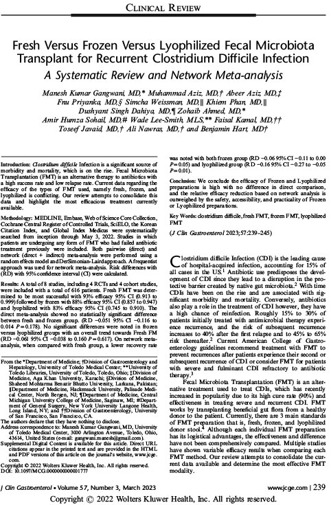 Results: A total of 8 studies, including 4 RCTs and 4 cohort studies, were included with a total of 616 patients. Fresh FMT was determined to be most successful with 93% efficacy 95% CI (0.913 to0.999) followed by frozen with 88% efficacy 95% CI (0.857 to 0.947) and lyophilized with 83% efficacy 95% CI (0.745 to 0.910). The direct meta-analysis showed no statistically significant difference between fresh and frozen group. (RD −0.051 95% CI −0.116 to 0.014 P=0.178). No significant differences were noted in frozen versus lyophilized groups with an overall trend towards Fresh FM (RD −0.061 95% CI −0.038 to 0.160 P=0.617). On network metaanalysis, when compared with fresh group, a lower recovery ratewas noted with both frozen group (RD −0.06 95% CI −0.11 to 0.00 P=0.05) and lyophilized group (RD −0.16 95% CI −0.27 to −0.05 P=0.01).