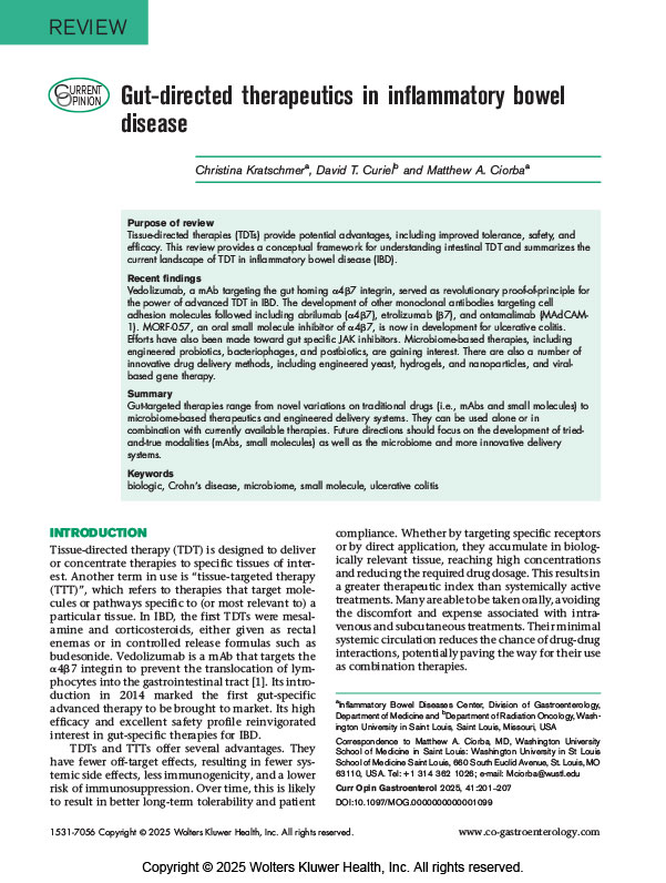 Vedolizumab, a mAb targeting the gut homing a4b7 integrin, served as revolutionary proof-of-principle for the power of advanced TDT in IBD. The development of other monoclonal antibodies targeting cell adhesion molecules followed including abrilumab (a4b7), etrolizumab (b7), and ontamalimab (MAdCAM1). MORF-057, an oral small molecule inhibitor of a4b7, is now in development for ulcerative colitis.Efforts have also been made toward gut specific JAK inhibitors. Microbiome-based therapies, including engineered probiotics, bacteriophages, and postbiotics, are gaining interest. There are also a number of innovative drug delivery methods, including engineered yeast, hydrogels, and nanoparticles, and viralbased gene therapy