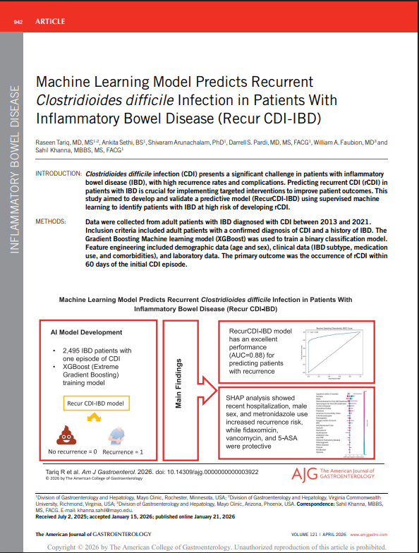 Data were collected from adult patients with IBD diagnosed with CDI between 2013 and 2021. Inclusion criteria included adult patients with a confirmed diagnosis of CDI and a history of IBD. The Gradient Boosting Machine learning model (XGBoost) was used to train a binary classification model. Feature engineering included demographic data (age and sex), clinical data (IBD subtype, medication use, and comorbidities), and laboratory data. The primary outcome was the occurrence of rCDI within 60 days of the initial CDI episode.