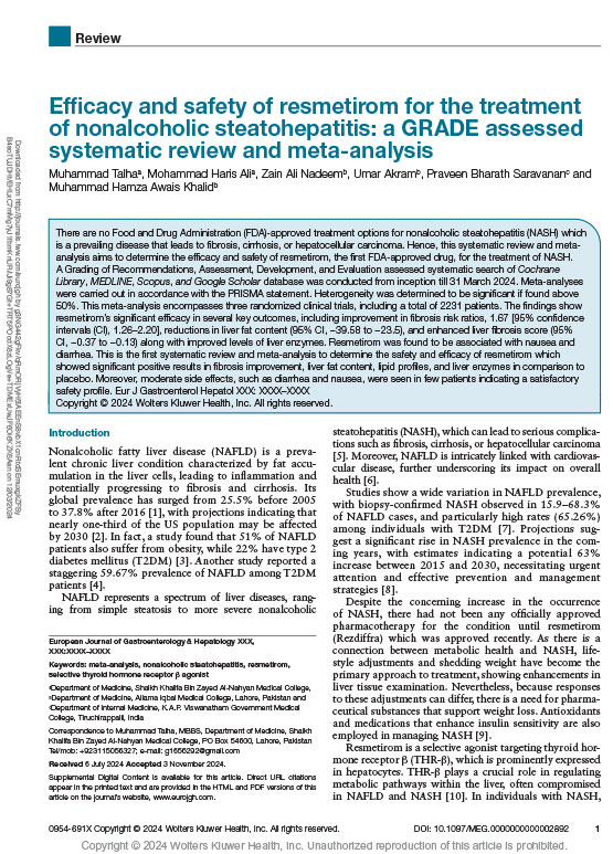 There are no Food and Drug Administration (FDA)-approved treatment options for nonalcoholic steatohepatitis (NASH) which is a prevailing disease that leads to fibrosis, cirrhosis, or hepatocellular carcinoma. Hence, this systematic review and metaanalysis aims to determine the efficacy and safety of resmetirom, the first FDA-approved drug, for the treatment of NASH. A Grading of Recommendations, Assessment, Development, and Evaluation assessed systematic search of Cochrane Library, MEDLINE, Scopus, and Google Scholar database was conducted from inception till 31 March 2024. Meta-analyses were carried out in accordance with the PRISMA statement. Heterogeneity was determined to be significant if found above 50%. This meta-analysis encompasses three randomized clinical trials, including a total of 2231 patients. The findings show resmetirom’s significant efficacy in several key outcomes, including improvement in fibrosis risk ratios, 1.67 [95% confidence intervals (CI), 1.26–2.20], reductions in liver fat content (95% CI, −39.58 to −23.5), and enhanced liver fibrosis score (95% CI, −0.37 to −0.13) along with improved levels of liver enzymes. Resmetirom was found to be associated with nausea and diarrhea. This is the first systematic review and meta-analysis to determine the safety and efficacy of resmetirom which showed significant positive results in fibrosis improvement, liver fat content, lipid profiles, and liver enzymes in comparison to placebo. Moreover, moderate side effects, such as diarrhea and nausea, were seen in few patients indicating a satisfactory safety profile.