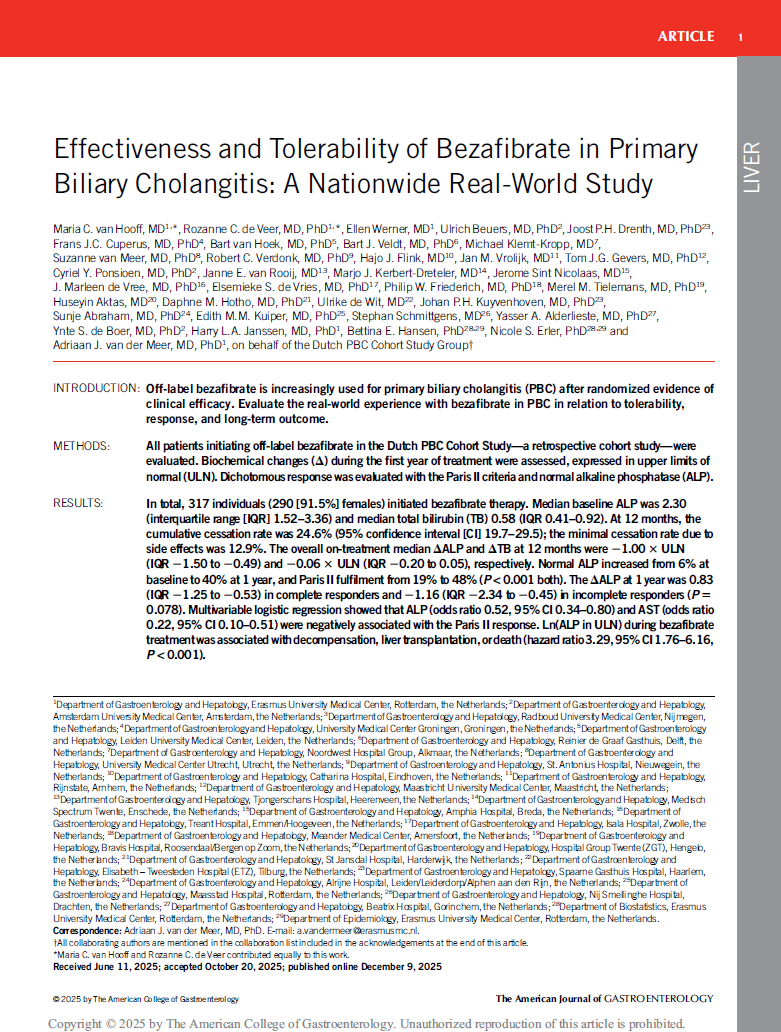 Off-label bezafibrate is increasingly used for primary biliary cholangitis (PBC) following randomized evidence of clinical efficacy. Evaluate the real-world experience with bezafibrate in PBC in relation to tolerability, response and long-term outcome.
