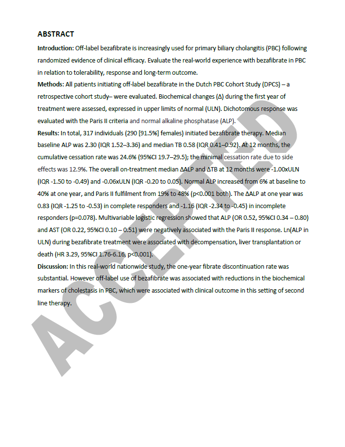 All patients initiating off-label bezafibrate in the Dutch PBC Cohort Study (DPCS) – a retrospective cohort study– were evaluated. Biochemical changes (Δ) during the first year of treatment were assessed, expressed in upper limits of normal (ULN). Dichotomous response was evaluated with the Paris II criteria and normal alkaline phosphatase (ALP).