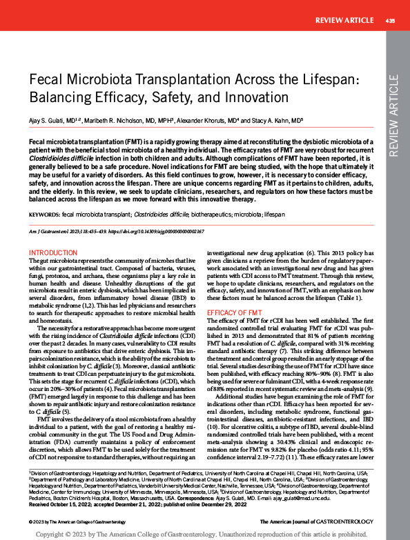 FMT involves the delivery of a stool microbiota from a healthy individual to a patient, with the goal of restoring a healthy microbial community in the gut. The US Food and Drug Administration(FDA) currently maintains a policy of enforcementdiscretion, which allows FMT to be used solely for the treatment of CDI not responsive to standard therapies, without requiring an investigational new drug application (6). This 2013 policy has given clinicians a reprieve from the burden of regulatory paperwork associated with an investigational new drug and has givenpatients with CDI access to FMT treatment. Through this review, we hope to update clinicians, researchers, and regulators on the efficacy, safety, and innovation of FMT, with an emphasis on how these factors must be balanced across the lifespan (Table 1).