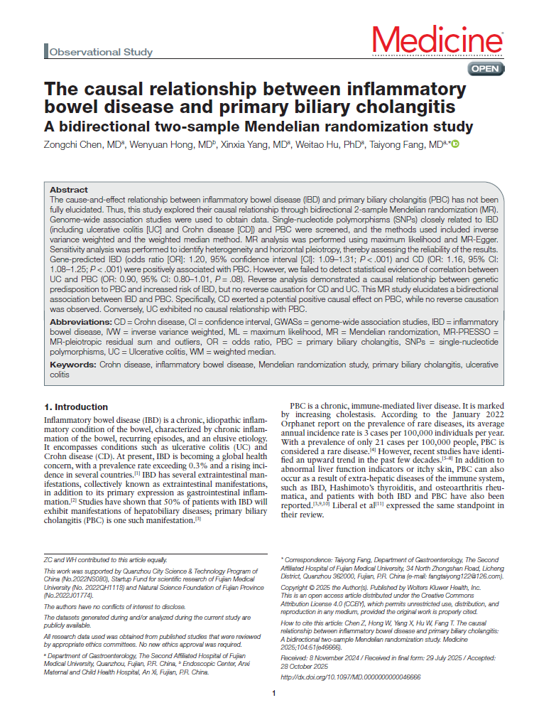The cause-and-effect relationship between inflammatory bowel disease (IBD) and primary biliary cholangitis (PBC) has not been fully elucidated. Thus, this study explored their causal relationship through bidirectional 2-sample Mendelian randomization (MR). Genome-wide association studies were used to obtain data. Single-nucleotide polymorphisms (SNPs) closely related to IBD (including ulcerative colitis [UC] and Crohn disease [CD]) and PBC were screened, and the methods used included inverse variance weighted and the weighted median method. MR analysis was performed using maximum likelihood and MR-Egger. Sensitivity analysis was performed to identify heterogeneity and horizontal pleiotropy, thereby assessing the reliability of the results. Gene-predicted IBD (odds ratio [OR]: 1.20, 95% confidence interval [CI]: 1.09–1.31; P < .001) and CD (OR: 1.16, 95% CI: 1.08–1.25; P < .001) were positively associated with PBC. However, we failed to detect statistical evidence of correlation between UC and PBC (OR: 0.90, 95% CI: 0.80–1.01, P = .08). Reverse analysis demonstrated a causal relationship between genetic predisposition to PBC and increased risk of IBD, but no reverse causation for CD and UC. This MR study elucidates a bidirectional association between IBD and PBC. Specifically, CD exerted a potential positive causal effect on PBC, while no reverse causation was observed. Conversely, UC exhibited no causal relationship with PBC.