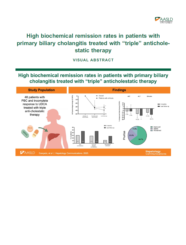 Four hundred seventy patients with PBC were seen, of which 71% were treated with UDCA only, 7% UDCA-OCA, 11.3% UDCA-fibrates, and 10.6% UDCA-OCA-fibrates. Among 50 patients on triple therapy, 82% had OCA as the first add-on therapy. Most patients (92%) received bezafibrate, while 8% had fenofibrate. Forty-eight patients were included in the final analysis. The mean follow-up time after triple therapy was 17.4 months. Triple therapy demonstrated median ALP reductions after 6 months of 33.3% (95% CI: 27.9%–37.6%) and 39.1% (95% CI: 30.7%–46.2%) at the last follow up; 30.2% of the patients had a normal serum ALP at 6 months, while 11.9% had normal ALP, AST, ALT, and bilirubin. Subgroup analysis of 28 patients followed for at least 12 months showed a 44.7% (95% CI: 33.3%–50.9%) median reduction in ALP. Liver stiffness remained relatively stable throughout the follow-up. Out of 34 patients with self-reported pruritus before triple therapy, 64.7% reported improvement, 11.8% worsened, and 23.5% had no change in itching intensity. On multivariable analysis, only older age at diagnosis (OR=1.12; 95% CI: 1.02–1.22) positively impacted ALP normalization.