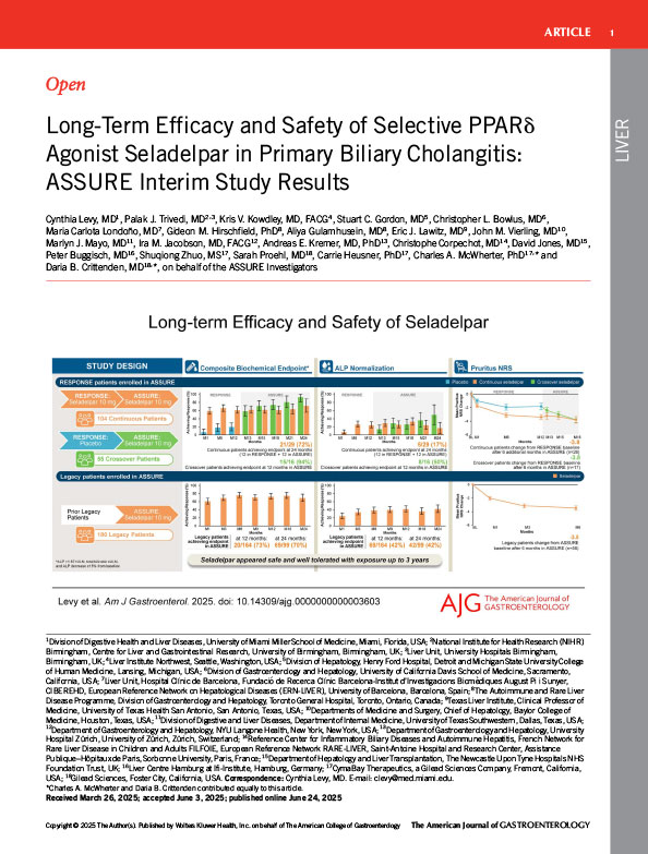 The objective of these analyses was to evaluate interim data from the ongoing, open-label, long-termefficacy and safety ASSURE study of seladelpar, a selective peroxisome proliferator-activated receptor δ agonist, in primary biliary cholangitis.