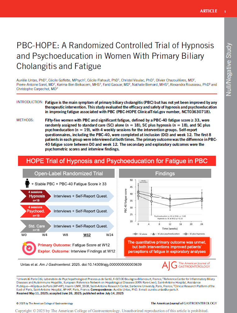 Objectives: Fatigue is the main symptom of primary biliary cholangitis (PBC), but has not yet been improved by any therapeutic intervention. This study evaluated the efficacy and safety of hypnosis and psychoeducation in improving fatigue associated with PBC (PBC-HOPE ClinicalTrial.gov number, NCT03630718).