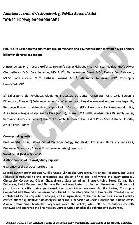 Results: The primary outcome was not achieved, with a median (interquartile range) difference in PBC-40 fatigue score of -3.0 (-10.0; 1.0), -6.0 (-8.0; -4.0), and -6.0 (-11.5; -4.8) for SC, SC-hypnosis, and SC-psychoeducation, respectively. The quantitative secondary outcomes were consistent with this result. The qualitative exploratory outcomes indicated that both interventions positively modi ied atients’ erce tions of fatigue, underlining the appropriation of the intervention. No serious adverse events occurred.