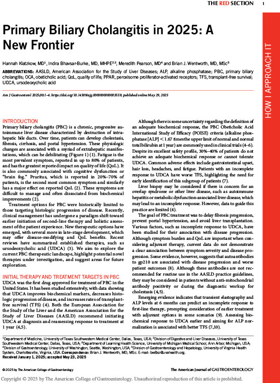 Treatment options for PBC were historically limited to those targeting histologic progression of disease. Recently, clinical management has undergone a paradigm shift toward earlier initiation of second-line therapy and holistic assessment of the patient experience. New therapeutic options have emerged, with several more in late-stage development, which may offer disease-modifying and QoL benefits. Recentreviews have summarized established therapies, such as ursodeoxycholic acid (UDCA) (3). We aim to explore the current PBC therapeutic landscape, highlight potential novel therapies under investigation, and suggest areas for future exploration.